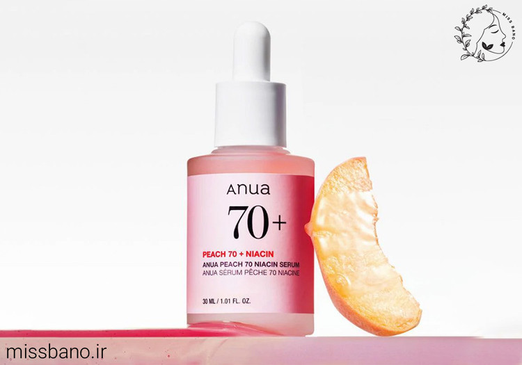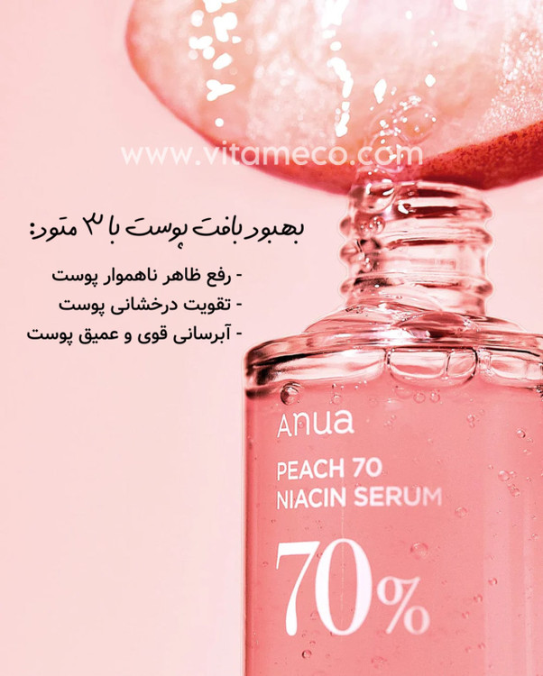 کاهش لکهای پوستی: سرم نیاسین هلو آنوا 70 درصد به لطف نیاسینامید، با مهار تولید ملانین، به کاهش لکهای تیره و یکدست شدن رنگ پوست کمک میکند.