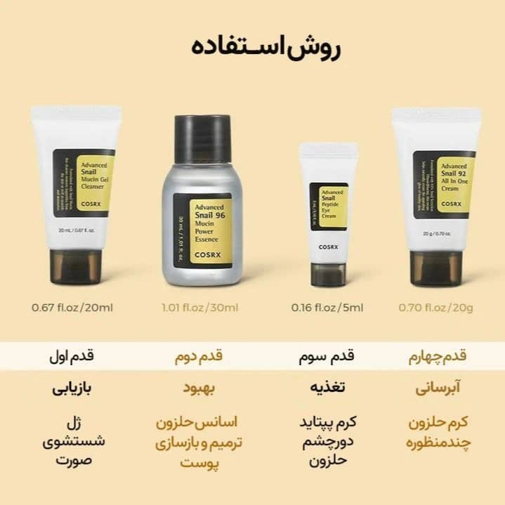 حجم پک کامل حلزون کوزارکس (COSRX All About Snail Kit) شامل محصولات زیر است: