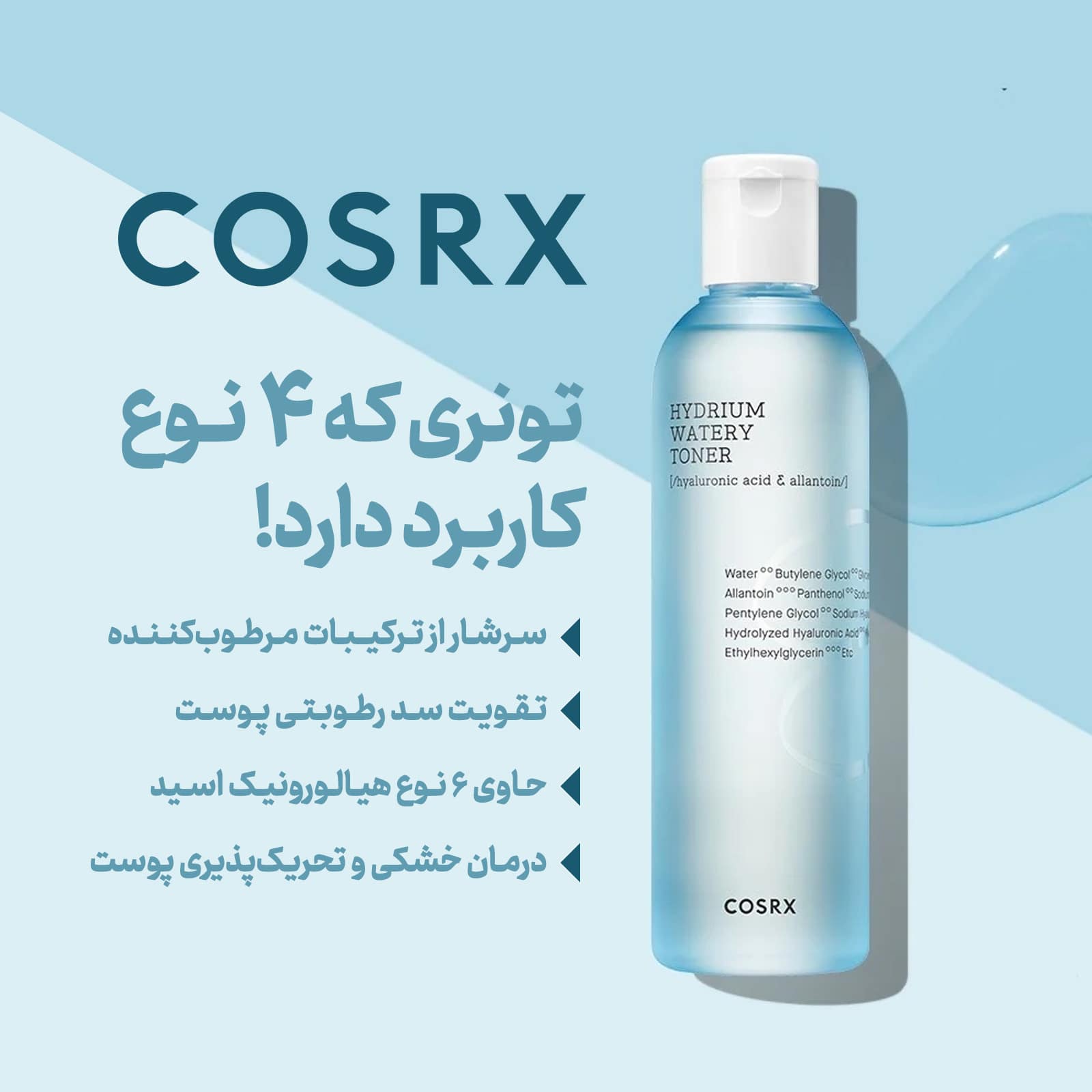 تونر آبرسان و مرطوب کننده COSRX، برای انواع پوست بخصوص پوست های کم آب مناسب است. این تونر دارای اثرات مرطوبکننده، بازسازیکننده و ضد التهابی است و استفاده از آن برای پوستهای مستعد آکنه نیز توصیه میشود.